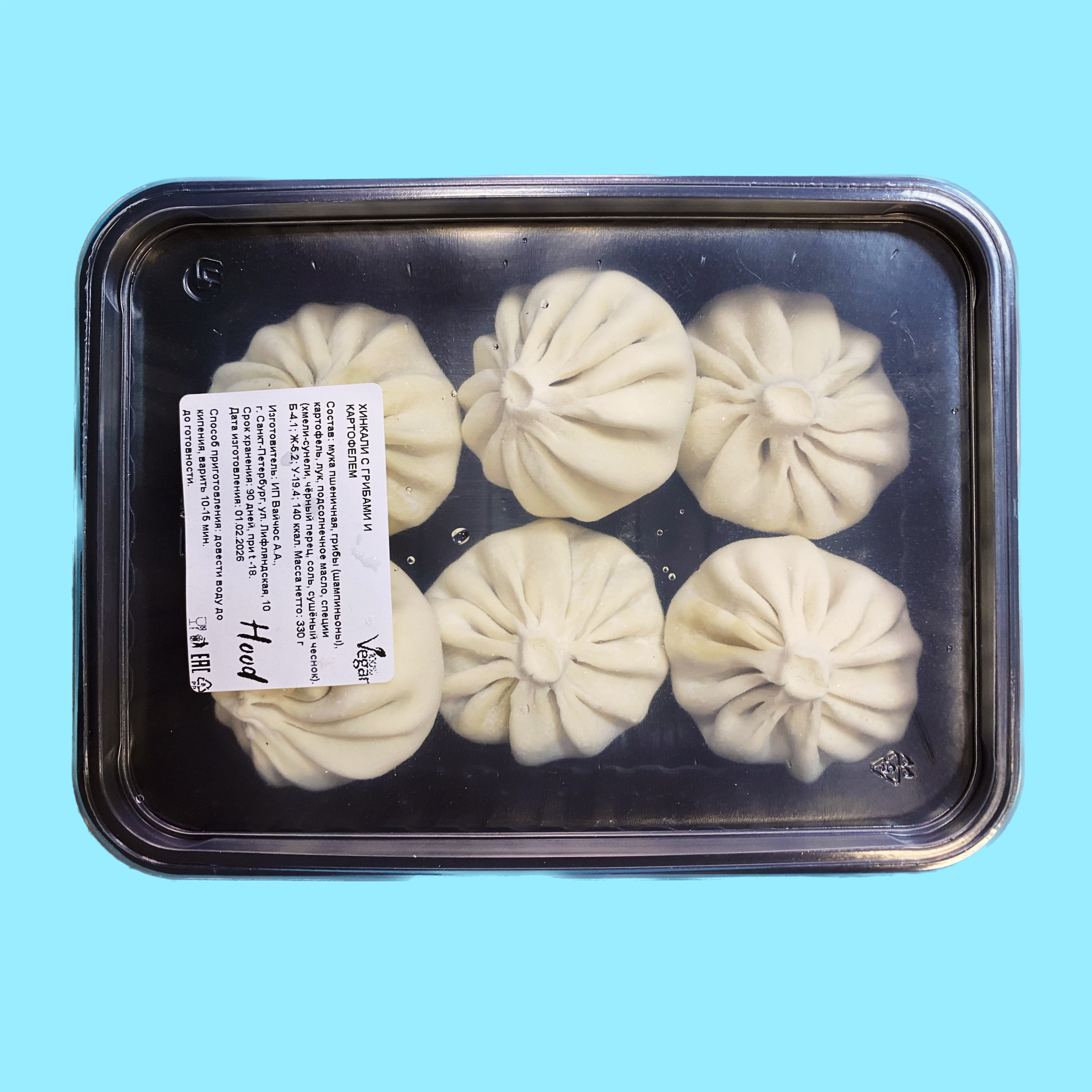 Состав: мука пшеничная, шампиньоны, картофель, лук, подсолнечное масло, хмели-сунели, черный перец, соль, чеснок.